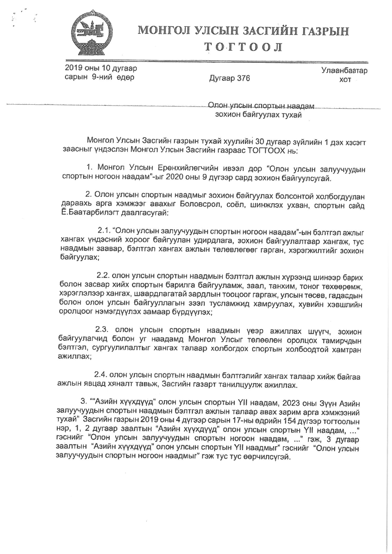 Зүүн азийн залуучуудын наадам зохион байгуулах тухай